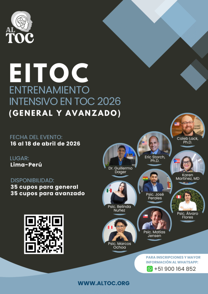 EITOC 2026 EITOC 2026 - Lima, Perú 3er Entrenamiento Intensivo para el Tratamiento del TOC en Latinoamérica | EITOC. Con una disponibilidad de 70 cupos (35 general y 35 avanzado) Perú 2026 Entrenamiento Intensivo en TOC – EITOC PERÚ 2026 ¡Profesionales de toda américa! El equipo ALTOC Entrenamiento intensivo 3 días de entrenamiento intensivo Descarga el Brochure para mas información presionando el botón. Descargar Inscripciones aquí Inscripciones